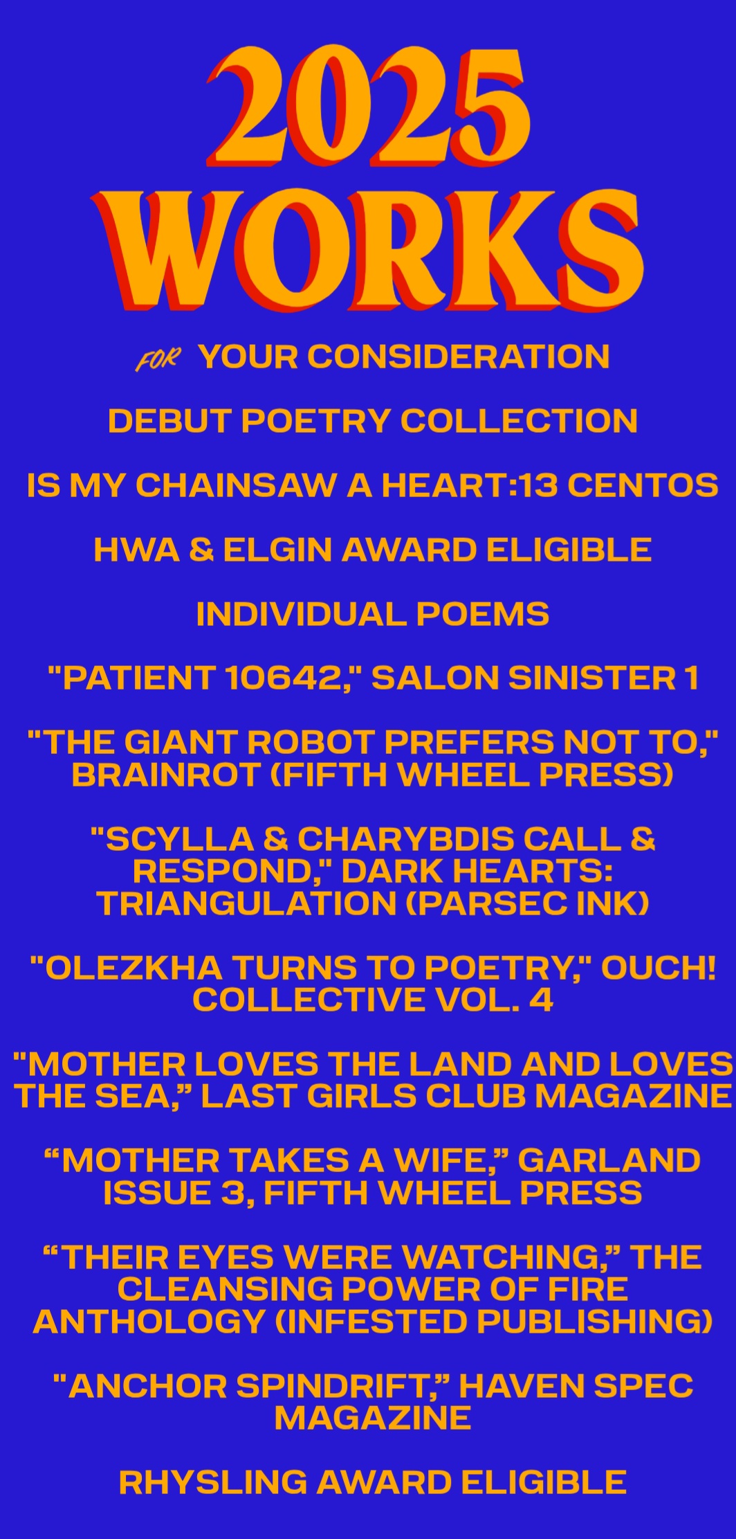 ALL 2025 poems except “untitled/oh my body” are eligible for the Rhysling Award. “Patient 10642” is long form by Rhysling criteria; all others are short form. Individual poems from Is My Chainsaw A Heart: 13 Centos are long form and individually eligible.